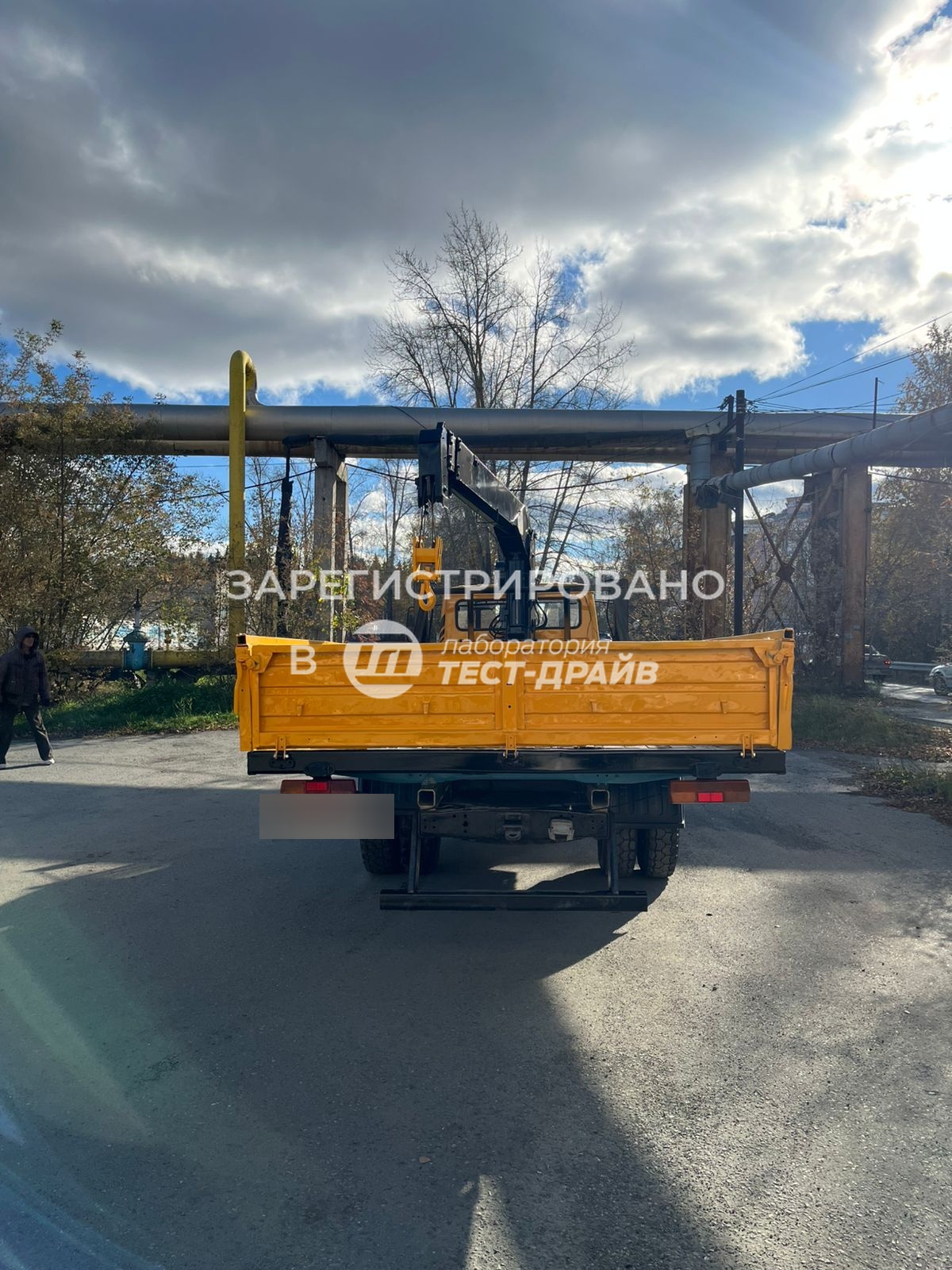 - На надрамнике за кабиной смонтирована краноманипуляторная установка (КМУ), закрепленная с помощью шпилек и аутригеров (опор).